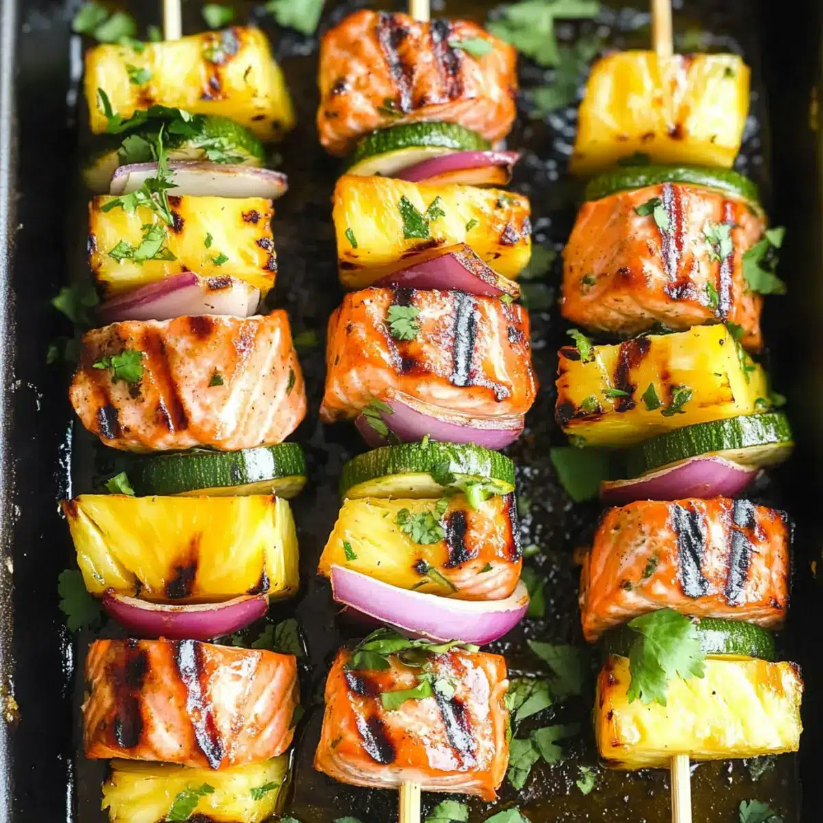 Cut the salmon fillet into 1-inch chunks and prepare fresh pineapple, red onion, and zucchini by slicing them into uniform pieces. Start threading the salmon, pineapple, red onion, and zucchini onto skewers, alternating each ingredient for a colorful display. Once all ingredients are on the skewers, brush generously with the prepared marinade, ensuring they’re well coated.