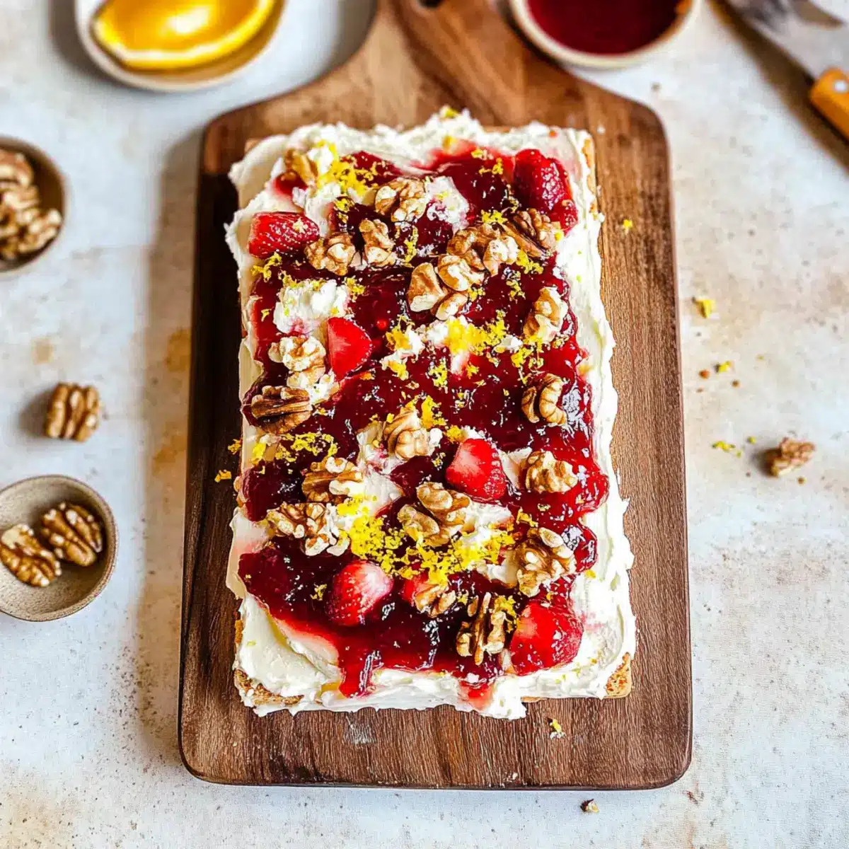 Now it’s time to add your toppings! Start by dolloping strawberry jam generously onto the butter, allowing it to nestle into the swirls. Next, sprinkle a handful of chopped walnuts evenly across the board. This adds a delightful crunch, making your butter board visually appealing and tempting.