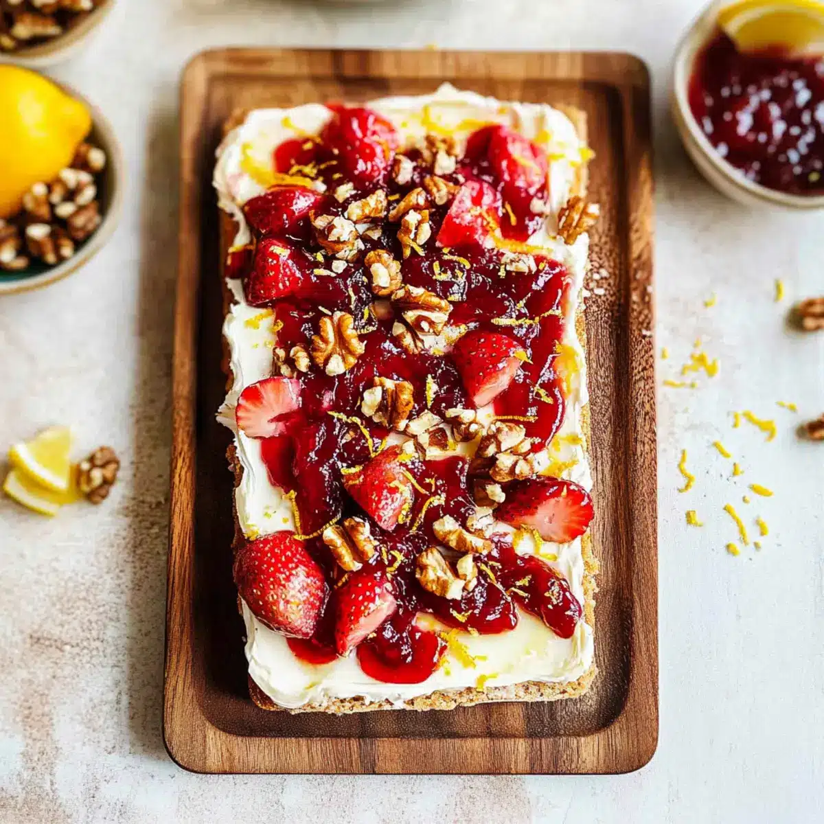 - Layer the toppings by dolloping strawberry jam onto the butter and sprinkling chopped walnuts.