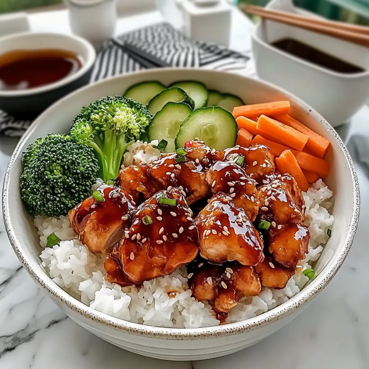 - Assemble the Bowls by scooping cooked rice into a bowl, topping with chicken and sauce, and arranging steamed vegetables.
