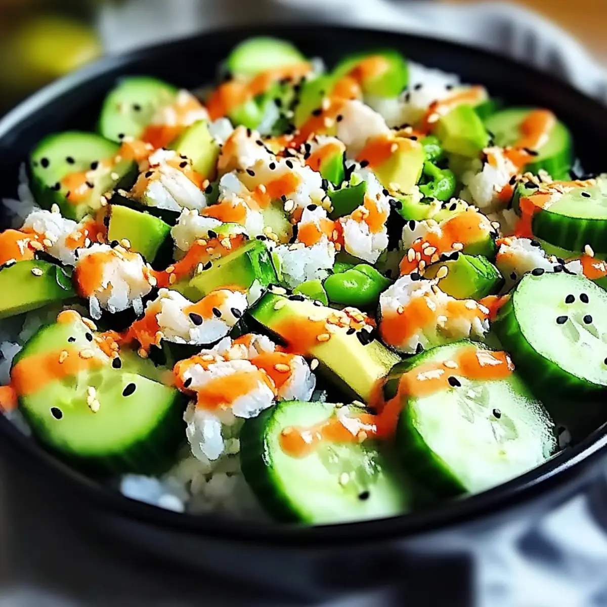 Freshness at Its Best: This California Roll Cucumber Salad showcases the best of summer produce, with crunchy cucumbers and creamy avocado harmonizing beautifully.