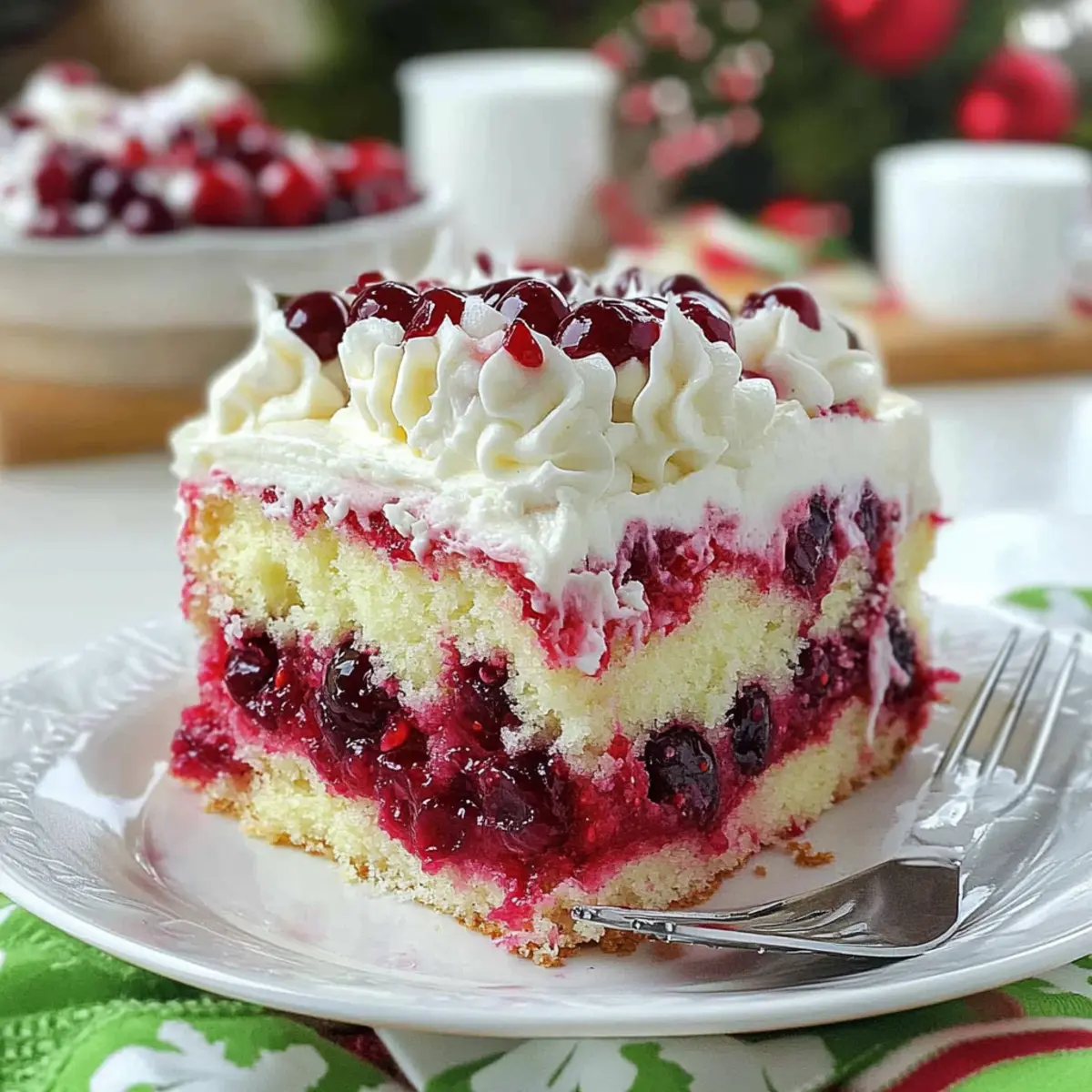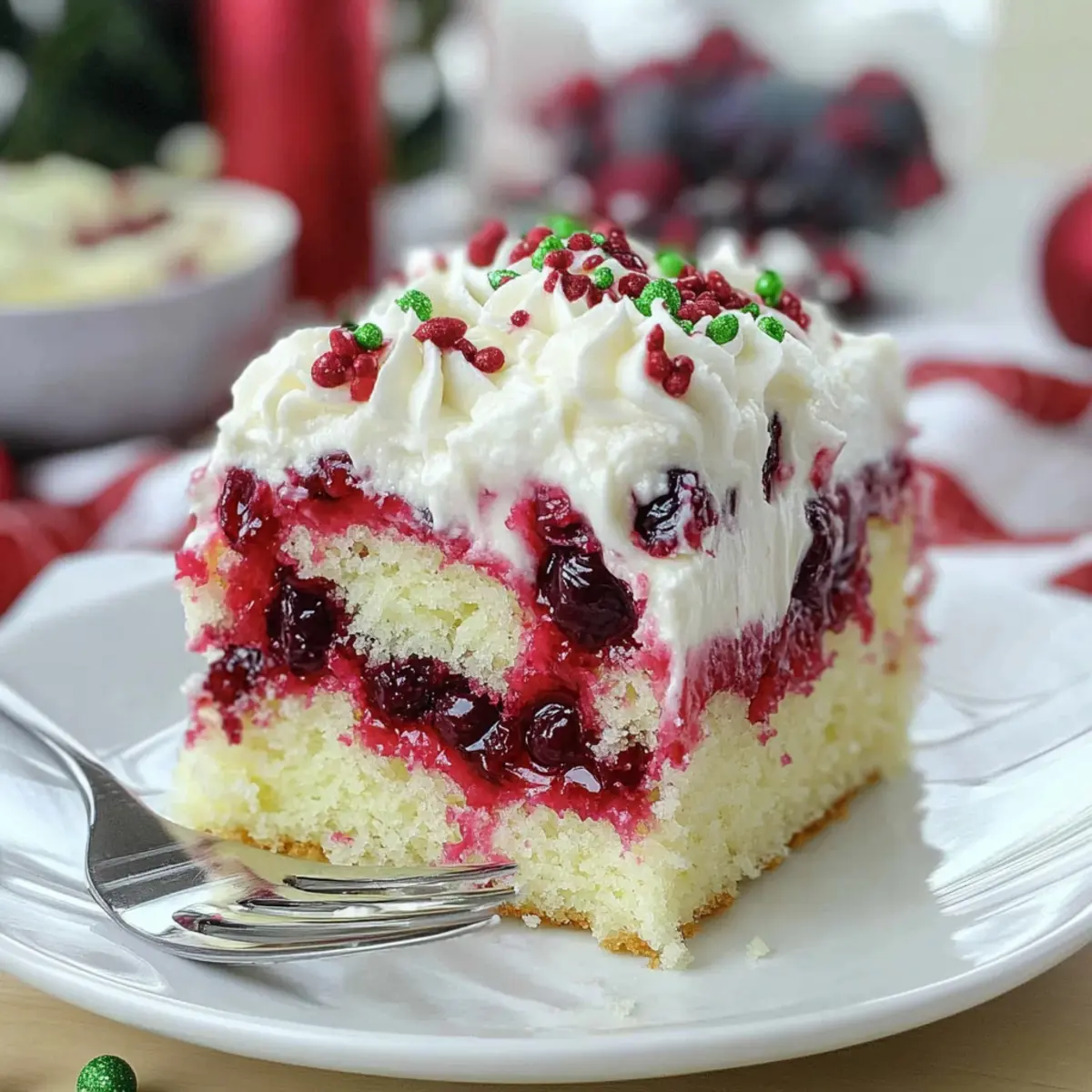 Moist and Flavorful: This Christmas Cranberry Poke Cake boasts a light, fluffy texture with a delightful tang from the cranberries, making each bite a holiday treat.