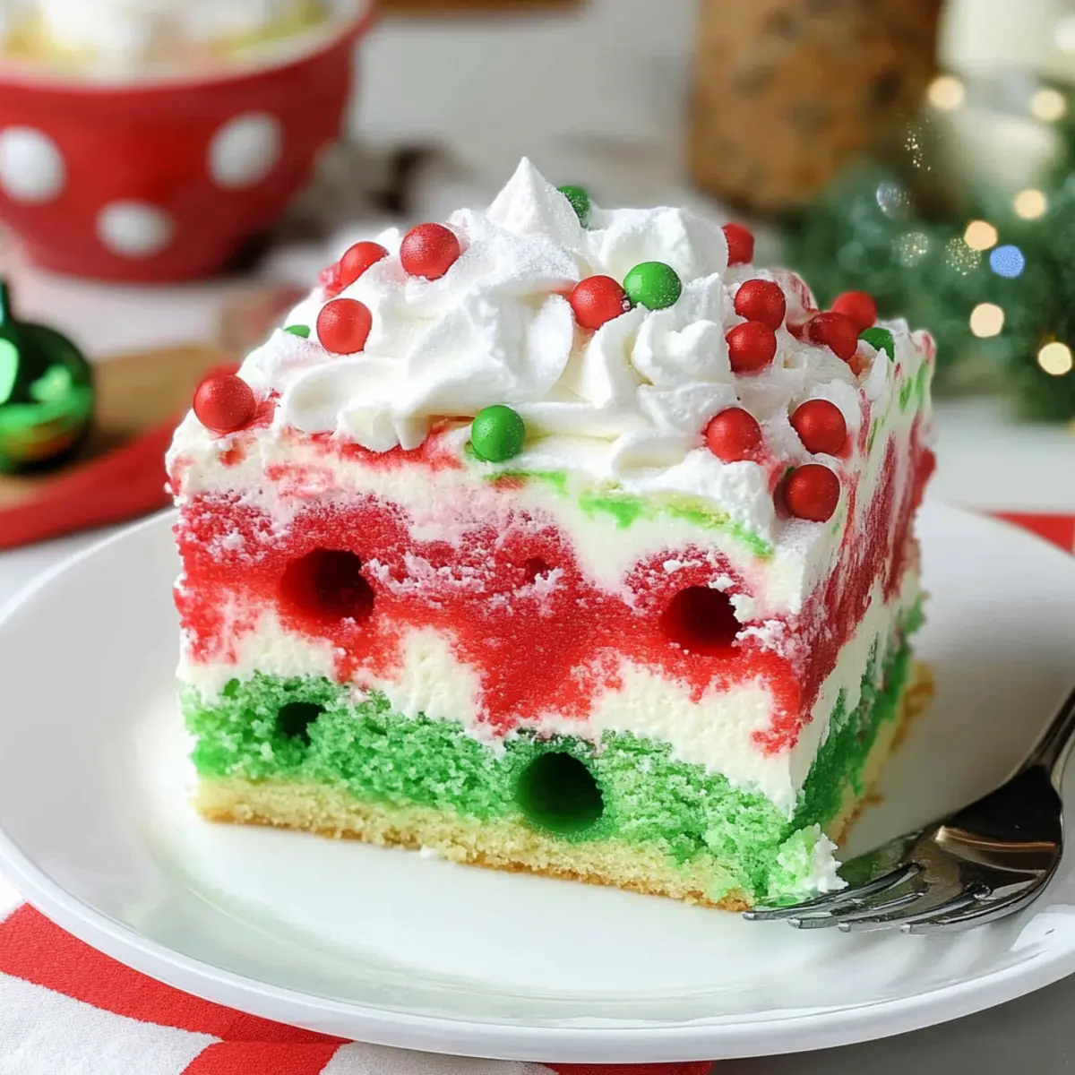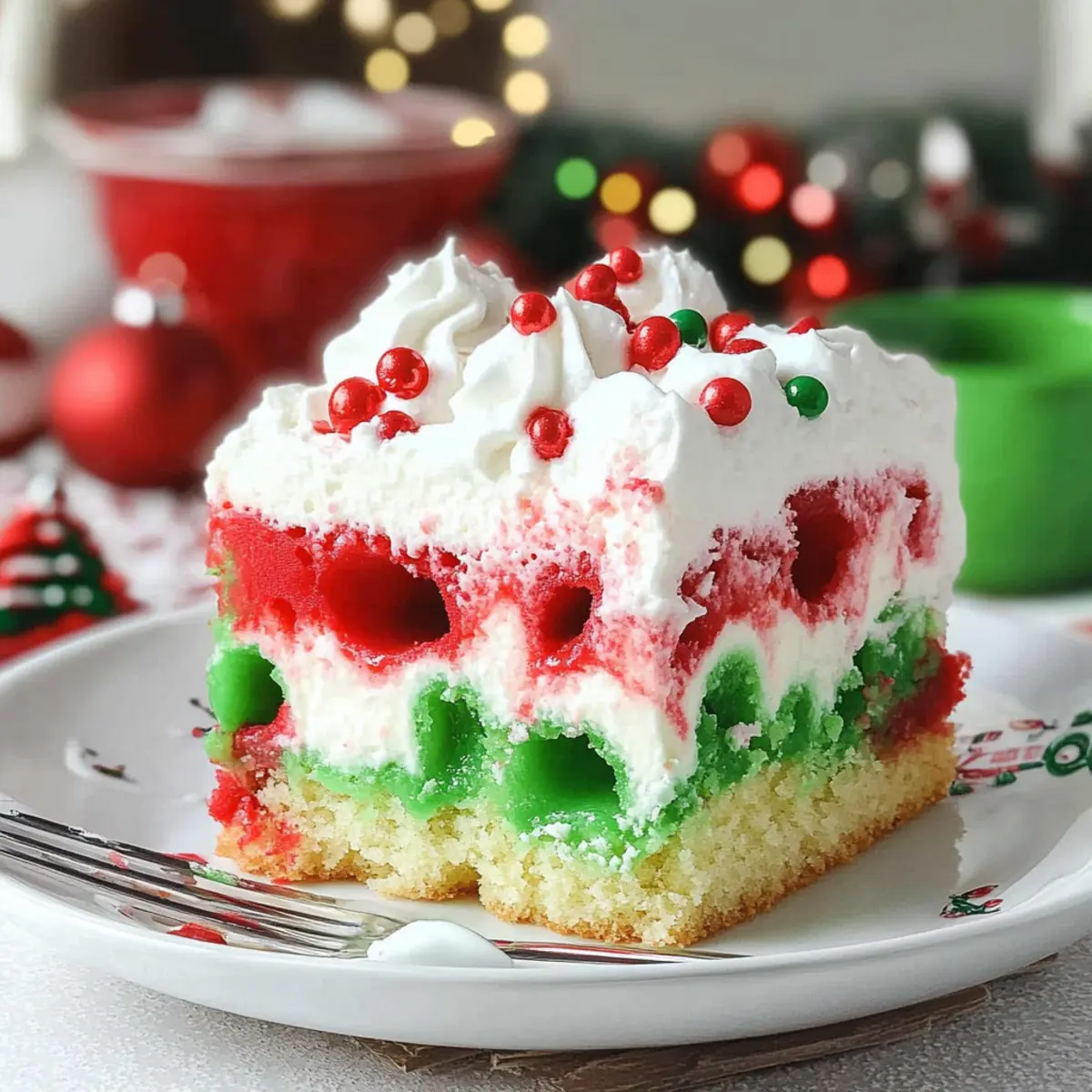 Layered Dessert: Create individual servings by layering the poke cake, pudding, and whipped cream in clear cups for a fun and festive presentation at your holiday gatherings, much like a delightful Christmas Trifle Dreamy.