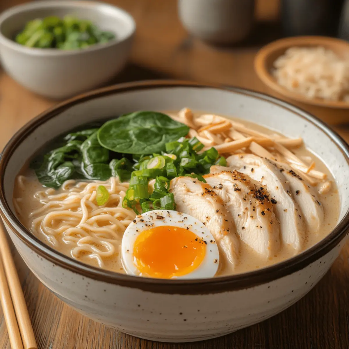 Garnish Ideas: Don’t skip the garnishes! Fresh green onions and soft-boiled eggs not only enhance the presentation but also add layers of flavor to your creamy chicken ramen.