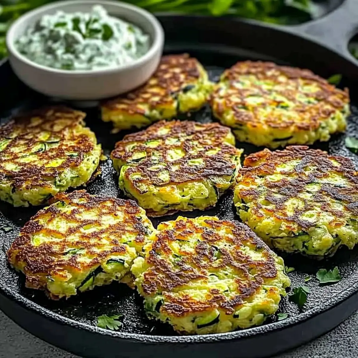 Your Crispy and Easy Zucchini Fritters are ready to be served! Enjoy them warm with your favorite dipping sauces, like tzatziki or marinara. These delightful bites are perfect for snacking or as a side dish, and they only get better with a tasty dip!