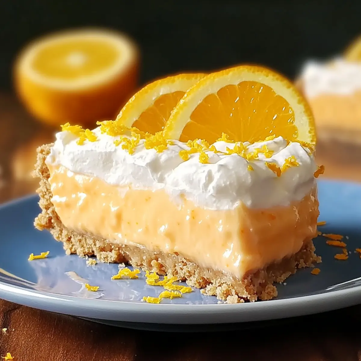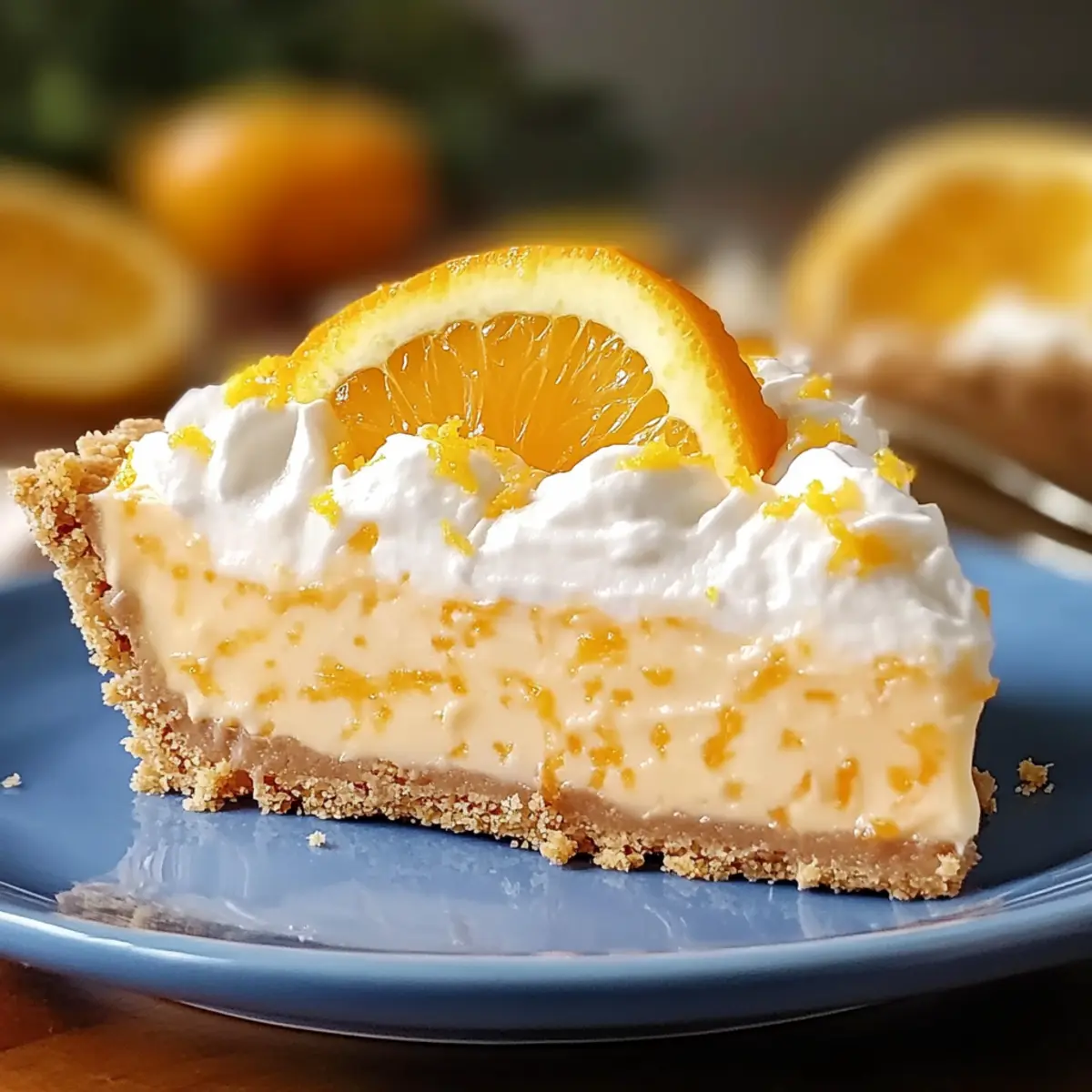 Once chilled, remove the pie from the refrigerator and garnish with fresh orange slices and a sprinkle of orange zest on top. You can add more whipped cream if desired to enhance the visual appeal and richness. Slice and serve this delightful no-bake dessert to enjoy a taste of summer in every bite!
