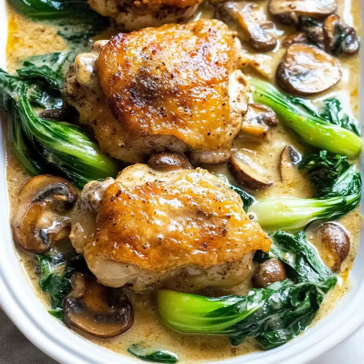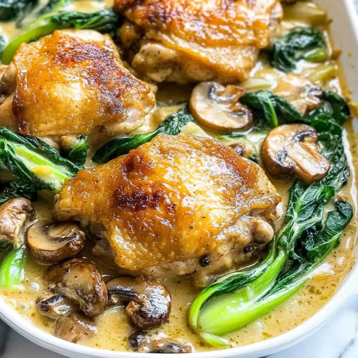 Taste the creamy gravy and adjust the seasoning if needed. Now, spoon the velvety gravy over the chicken thighs, bok choy, and mushrooms generously. Serve this scrumptious Easy Smothered Chicken with Bok Choy and Mushrooms hot, alongside your favorite side like mashed potatoes or rice, and enjoy the comforting flavors together!