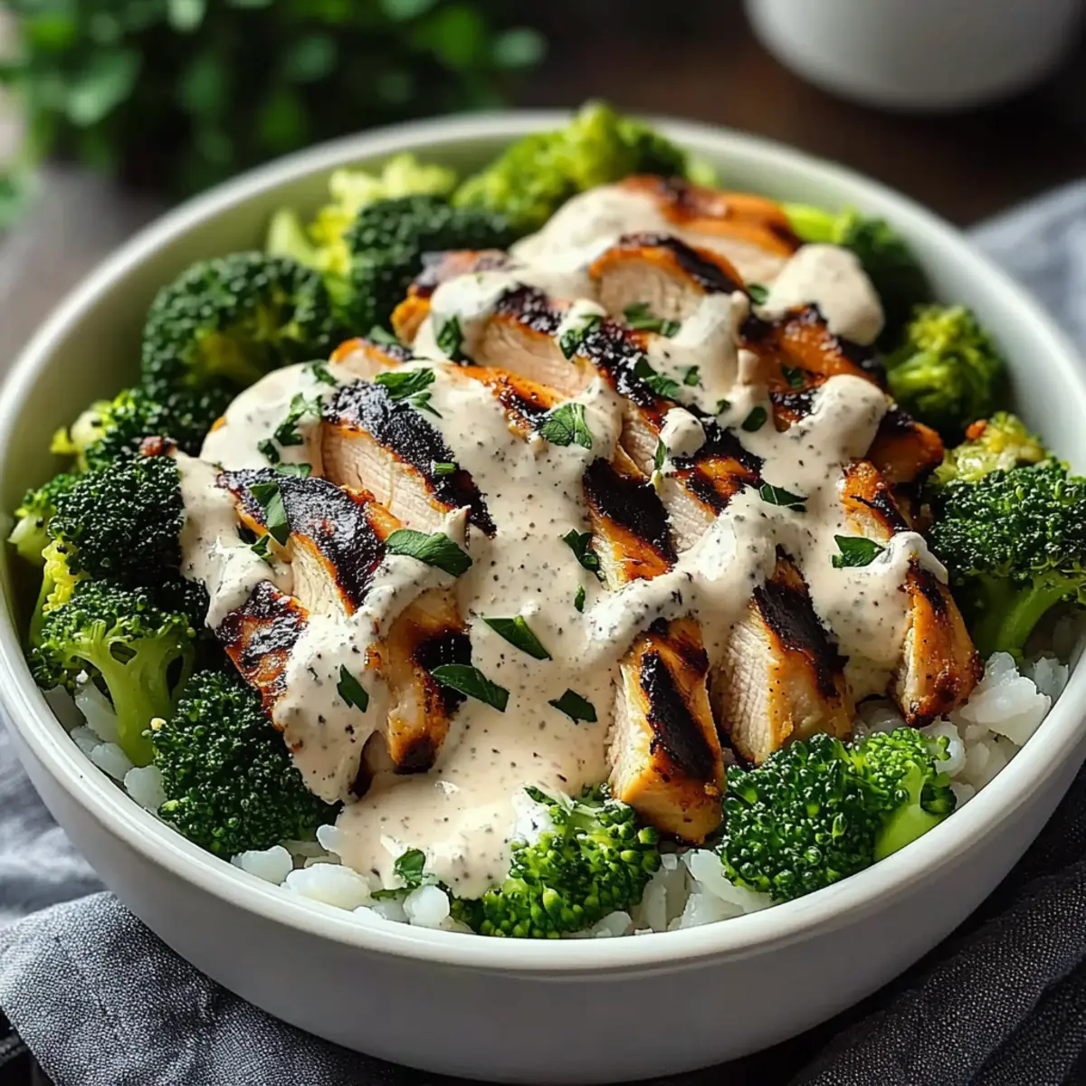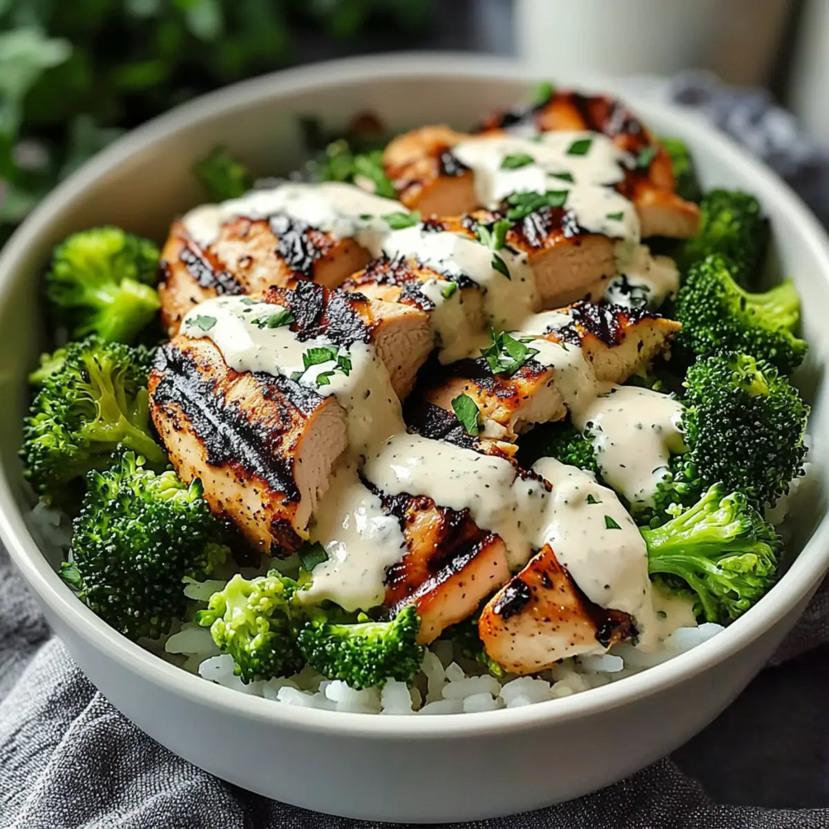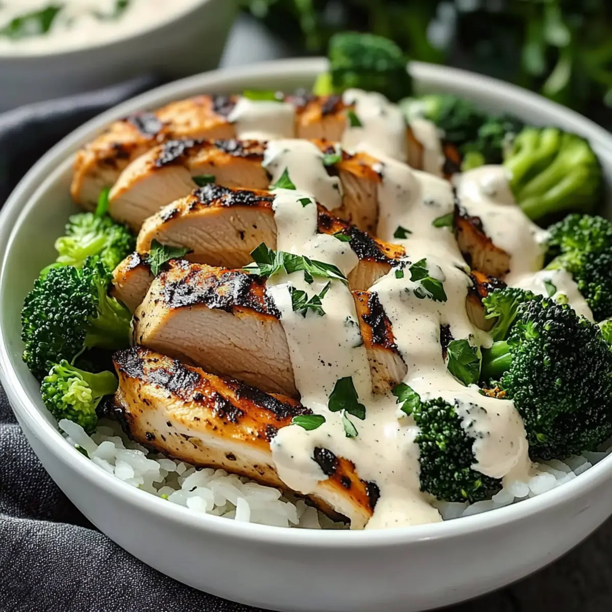 Grilled Chicken & Broccoli Bowls with Creamy Garlic Sauce Bliss