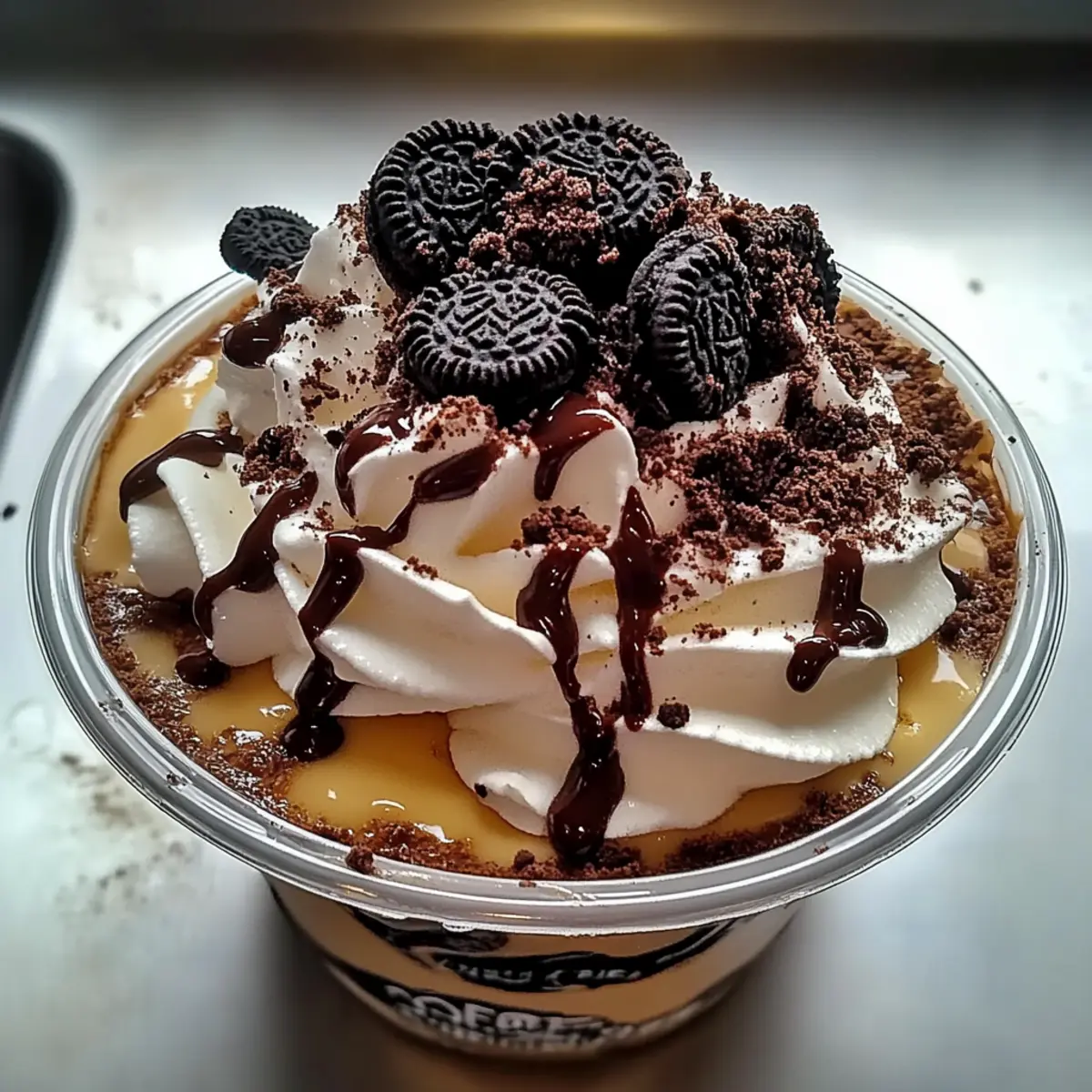 - Sprinkle crushed Oreos or chocolate shavings generously over the whipped cream. Lightly dust with cocoa powder.