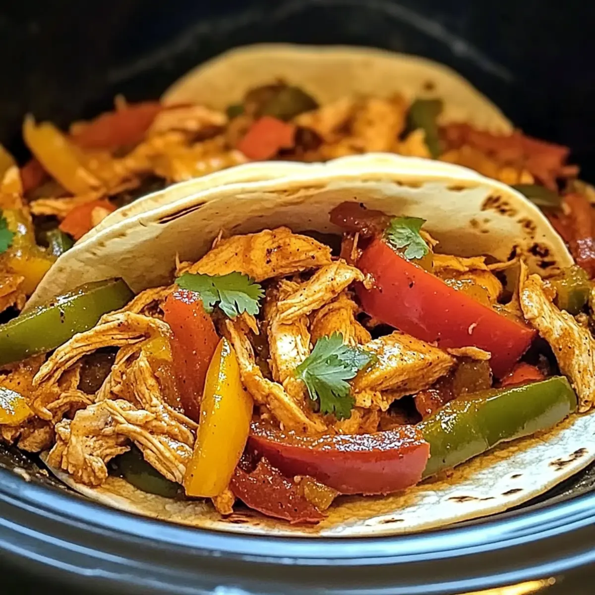 Warm your flour or corn tortillas in a pan or microwave. Spoon generous portions of the chicken and veggie mixture onto each tortilla. Top with fresh cilantro, shredded cheese, sour cream or Greek yogurt, and salsa to customize your Juicy Crockpot Chicken Fajitas before savoring every delicious bite.