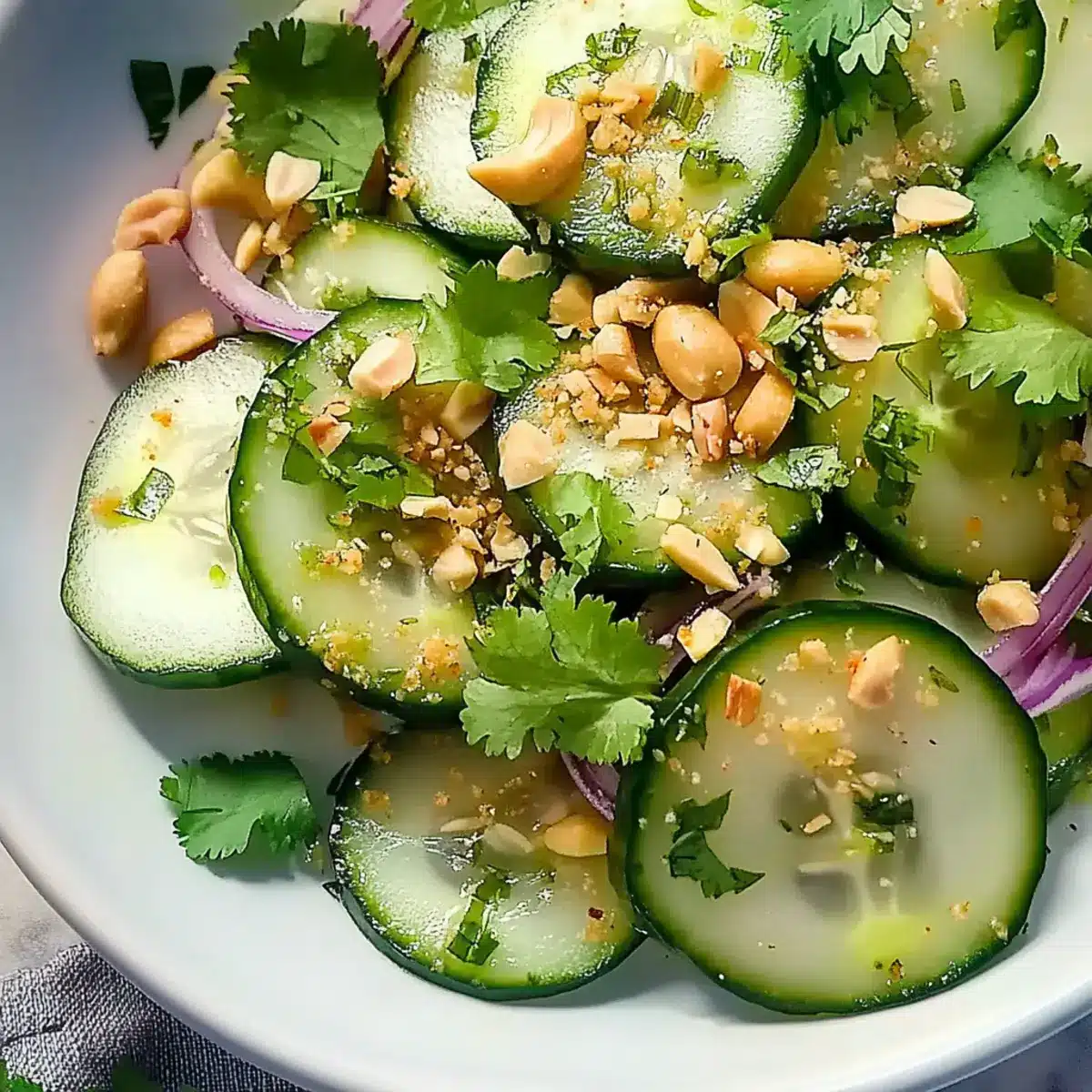 When you’re ready to serve, take out your chilled salad and give it a gentle stir. Just before plating, sprinkle a generous handful of chopped peanuts on top. This final touch not only adds crunch but also a rich, nutty flavor that perfectly complements the crisp cucumbers in your Juicy Thai Cucumber Salad.
