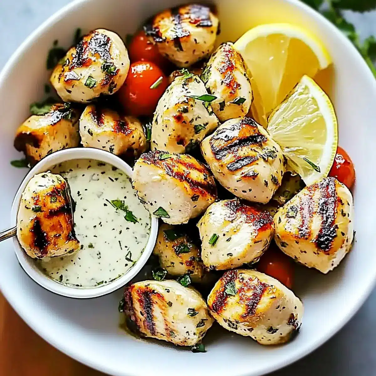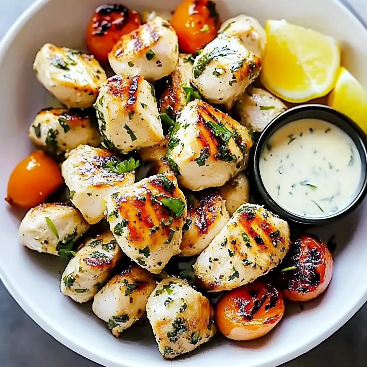As the last batch of Mediterranean Chicken Bites comes off the grill, transfer them to a serving plate. Garnish with lemon wedges for an extra zesty kick and serve with ranch dressing for dipping. The enticing aroma and beautiful charred appearance will surely impress your guests and make this dish a standout at any gathering.