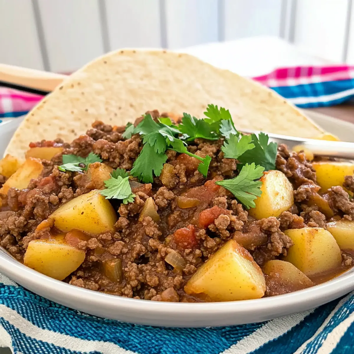 Once the cooking time is complete and the potatoes are soft, taste your Picadillo and adjust the seasoning if needed. When ready, remove the skillet from heat. Garnish with fresh cilantro for a vibrant touch, adding a hint of freshness to the warm, hearty dish.