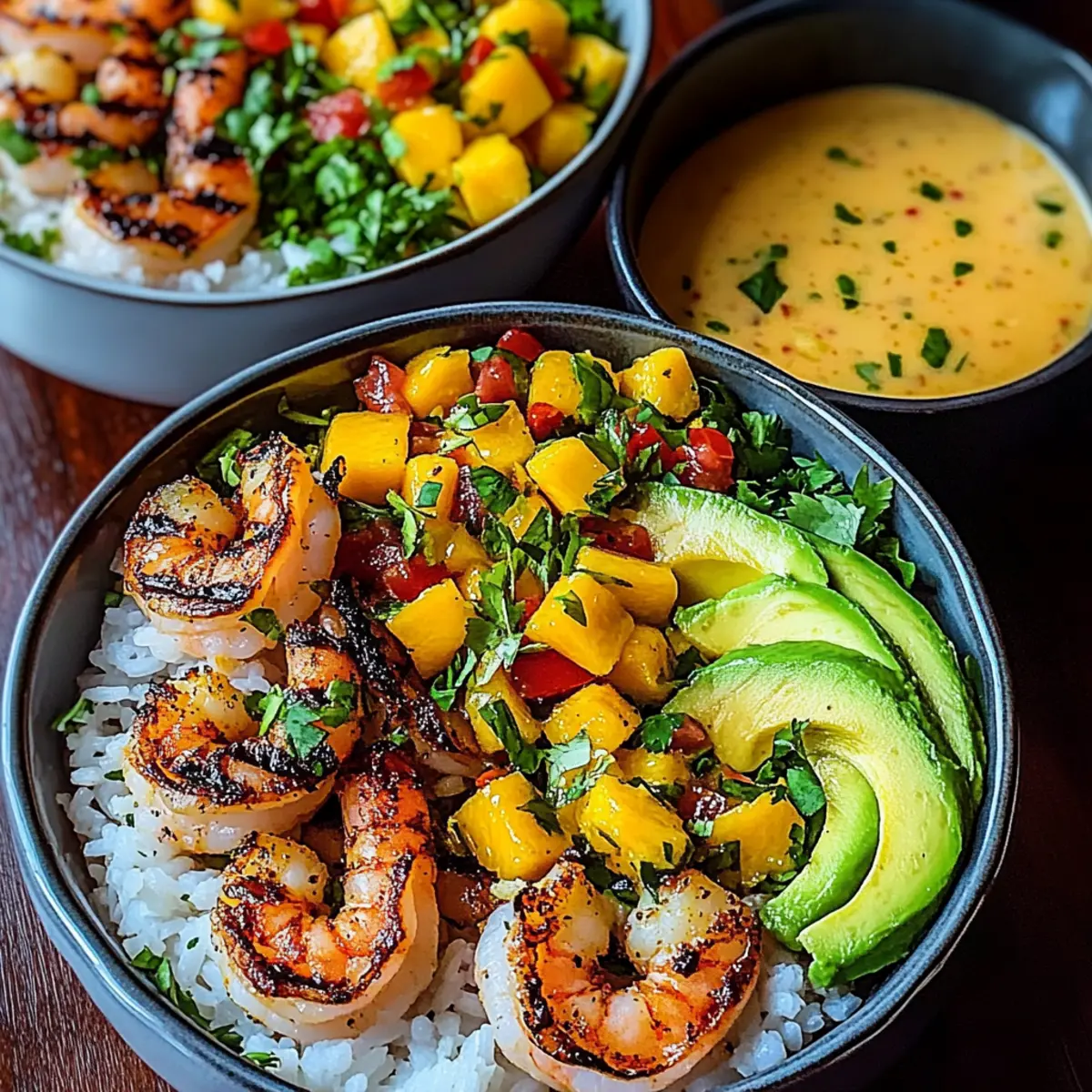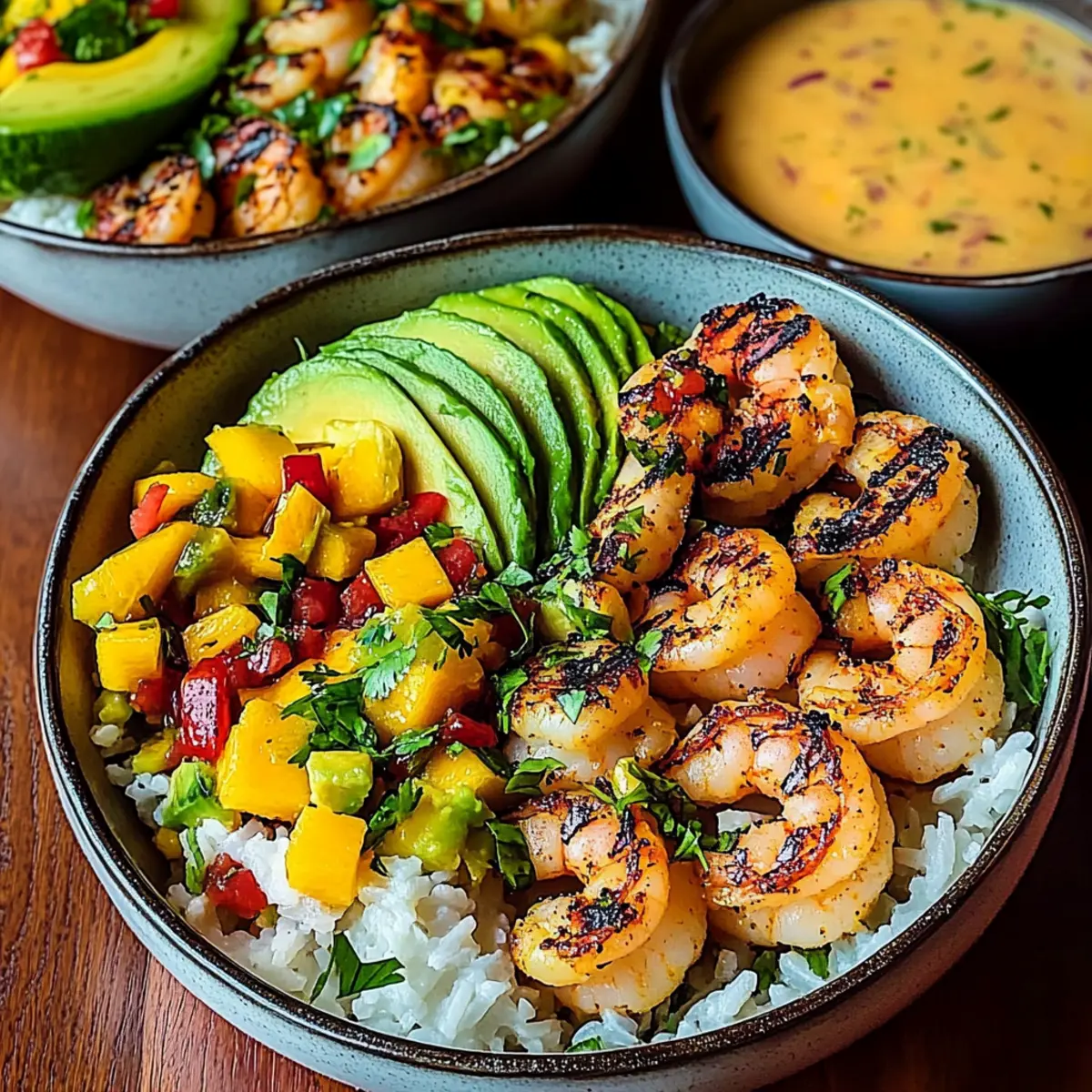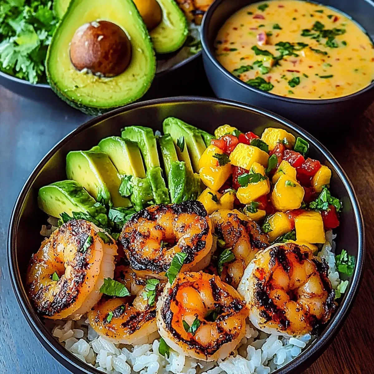 - Assemble bowls with rice as the base, topped with grilled shrimp, avocado slices, and mango salsa. Drizzle with lime-chili sauce and garnish.