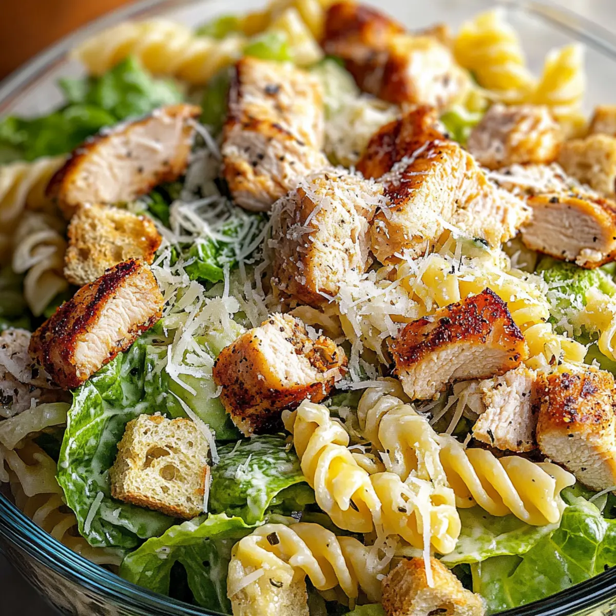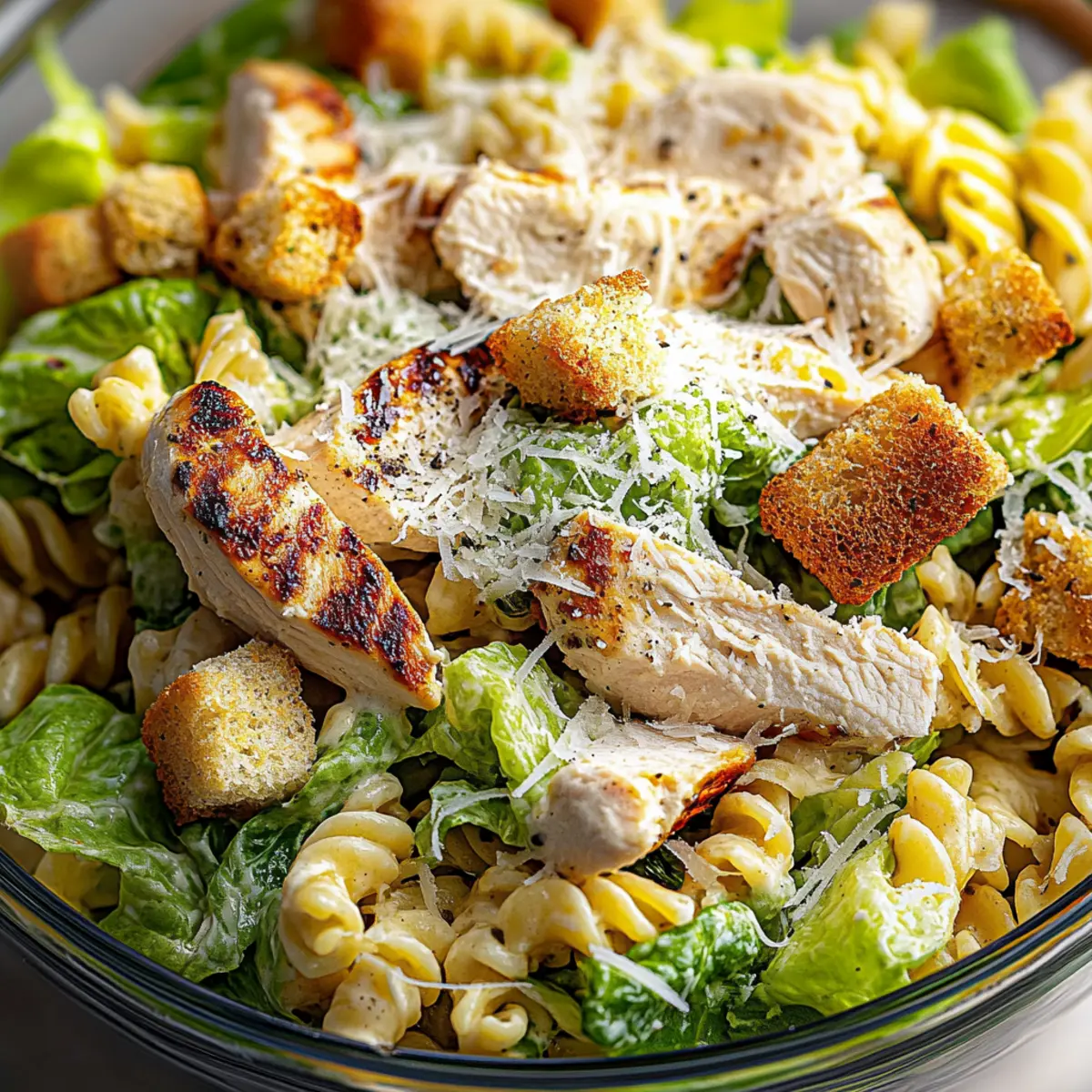 These Chicken Caesar Pasta Salad options are perfect for those looking to save time during busy weeks! You can prepare the pasta, chicken, and dressing up to 3 days in advance. Cook the pasta, rinse it with cold water, and toss it with a drizzle of olive oil to prevent sticking. Grill or pan-sear the chicken, slice it, and store it in an airtight container. Mix your dressing and keep it chilled in the fridge. Just before serving, combine everything with fresh romaine lettuce and croutons to maintain that delightful crunch. This way, you’ll have a delicious Chicken Caesar Pasta Salad ready with minimal effort, allowing you to enjoy the flavors without the hassle!